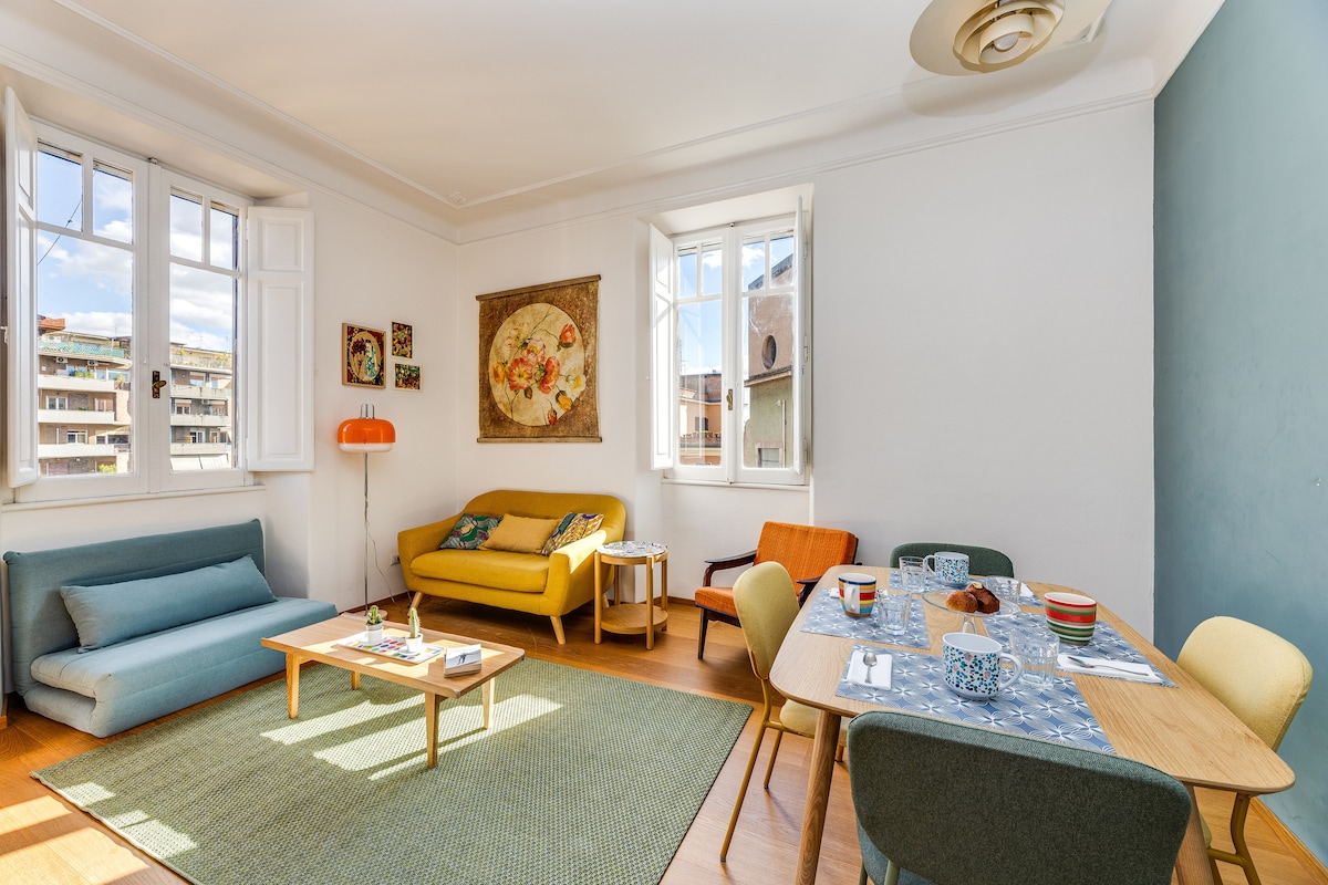 Atmosfere classico-chic, dettagli d'arredo che meritano più di uno sguardo. Questo appartamento è ideale per una famiglia o 2 coppie. È un punto di partenza perfetto per scoprire e vivere la bellezza della città e del tipico quartiere di Trastevere. L'appartamento è composto da un ampio soggiorno, 1 camera da letto, 1 cameretta/studio con un comodo letto estraibile, 1 bagno, una piccola cucina completamente attrezzata.