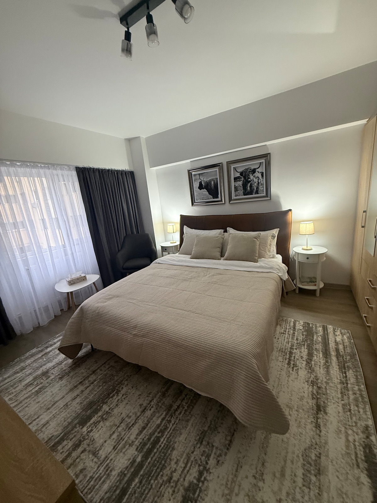 Apartament cu un dormitor,într o zona linistita. Dormitor cu pat matrimonial, bucătărie complet utilata, living spațios cu o canapea extensibila.