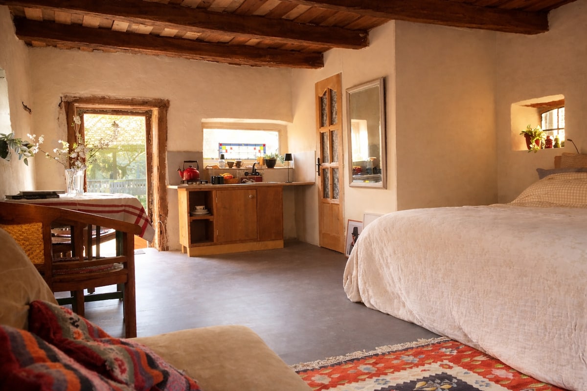 Newly restored and converted barn, a magical space with lovely views of the surrounding mountains and hills. The barn is ideal for 2-3 people, but can accomodate a maximum of 5, with a double, a single and a sofa bed (access to sleeping space requires climbing stairs or a ladder). 20 metres from the barn, there is wood and a fireplace for an evening chat and stargazing by the fire. An outdoor shower with solar heated water is also available. The kitchen is functional and has amazing views!