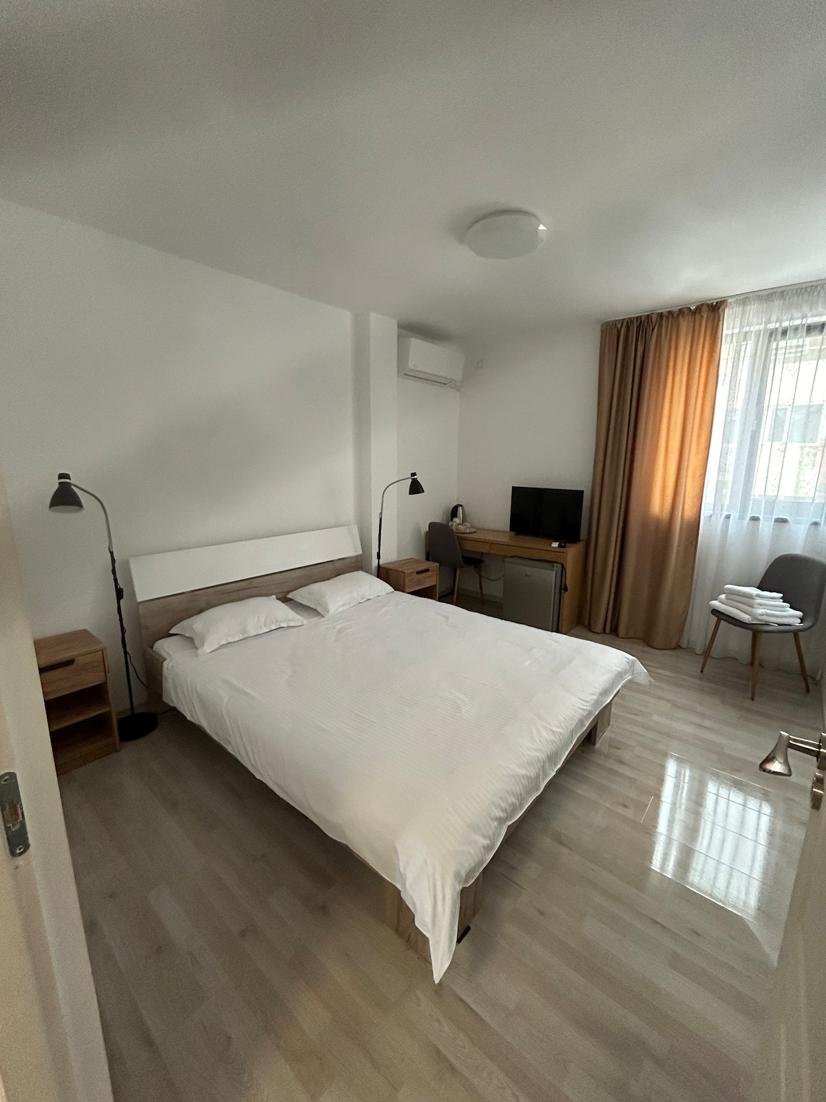 Camera dubla cu pat matrimonial si baie proprie in cel mai nou Aparthotel din Sibiu. Glam Apartments se afla la 2 km de centrul orasului si in proximitatea mai multor restaurante si magazine. Parcare privata supravegheata video Check-in independent prin cod de acces pentru a va putea bucura de flexibilitate la sosire si la plecare
