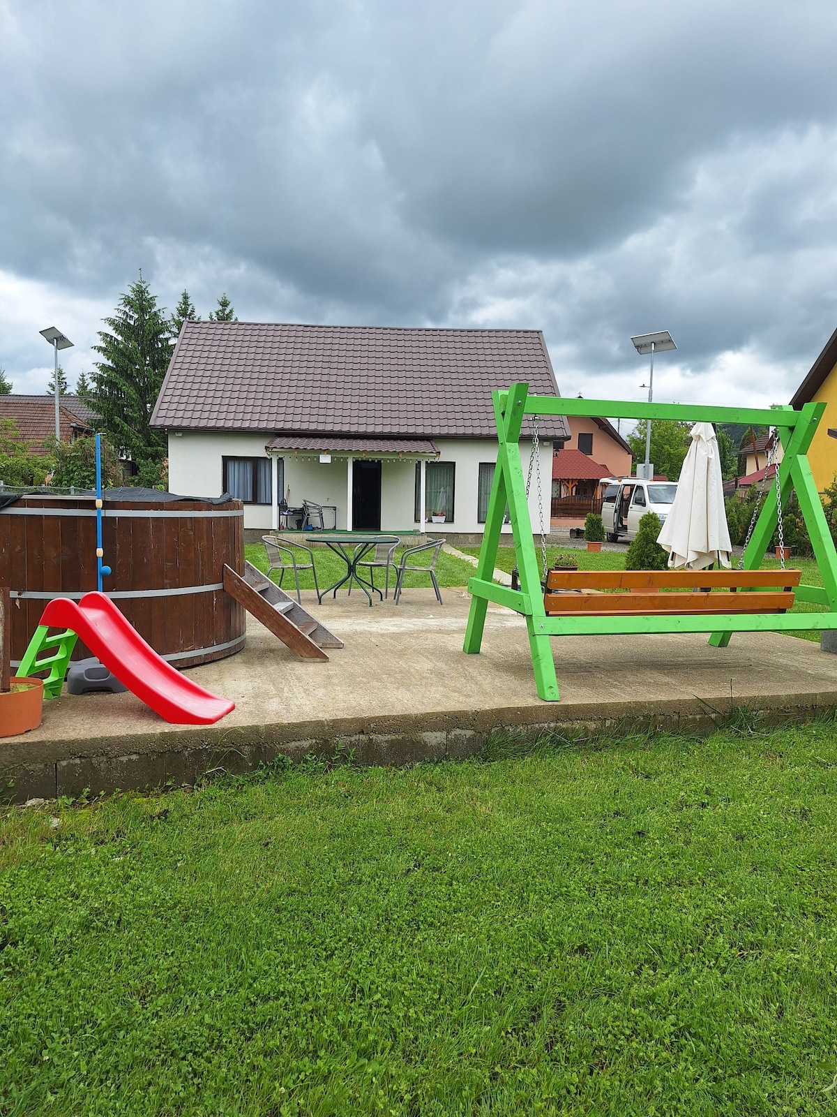 We provide to our guests a private little house with two bedroom. The entire location is a Romanian traditional country house, you can feel a little part of the life that our grandparents use to live. We have a garden with bio vegetables, we have chickens, ducks and a dog.