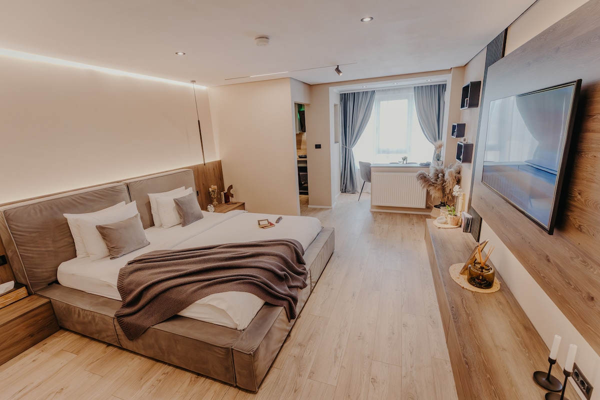 Bine ai venit la Studio 7, un refugiu urban situat la doar 10 minute de centrul Timișoarei. Deși amplasat într-un bloc din perioada comunistă, interiorul modern surprinde printr-un design elegant și atent gândit, unde confortul contemporan se îmbină armonios cu accentele stilate. Fiecare detaliu este ales pentru a crea o atmosferă caldă și relaxantă, iar finisajele de calitate oferă un plus de confort. Un spațiu ideal pentru a explora orașul și a te relaxa într-un ambient premium.