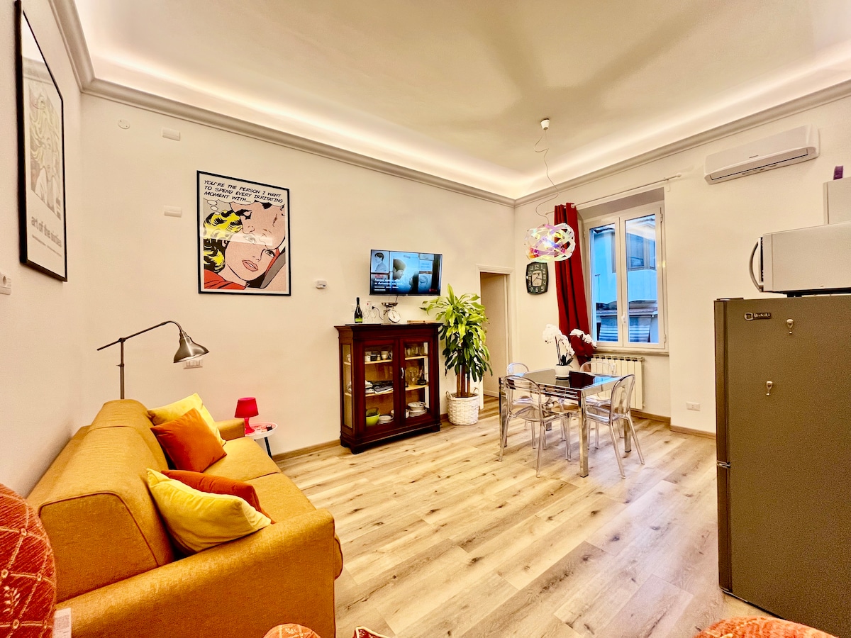 Lussuoso appartamento climatizzato di 100 metri quadri al centro di Roma nel vivace e pittoresco quartiere Monti, al primo piano di un palazzo d'epoca adiacente alla Basilica Papale di Santa Maria Maggiore, adatto per gruppi o famiglie. La posizione e' strategica per visitare i maggiori siti della citta', a soli 500 metri dalle fermate metro linee A e B e dalla Stazione ferroviaria centrale Roma Termini. Il Colosseo e facilmente raggiungibile a piedi in 15 minuti. Supermercato a 50 metri.