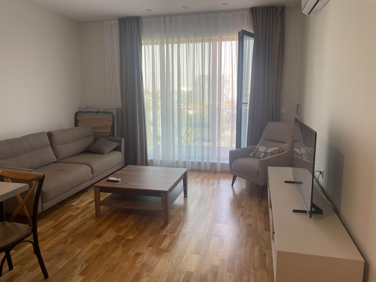 Aceasta locuință călduroasă și luminoasă este situată într-un complex rezidențial nou și modern ce oferă pază și recepție permanentă. Locul de parcare în subteranul imobilului. Spațiul: - un dormitor cu pat dublu - living cu canapea extensibila - Netflix & Wi-Fi - bucatarie cu aragaz, cuptor, frigider, mașina de spălat vase, mașina de spălat haine, expresor - o baie cu cadă și uscător de păr - aer condiționat în fiecare cameră - fier și masă de călcat -bucătăria este utilată comple