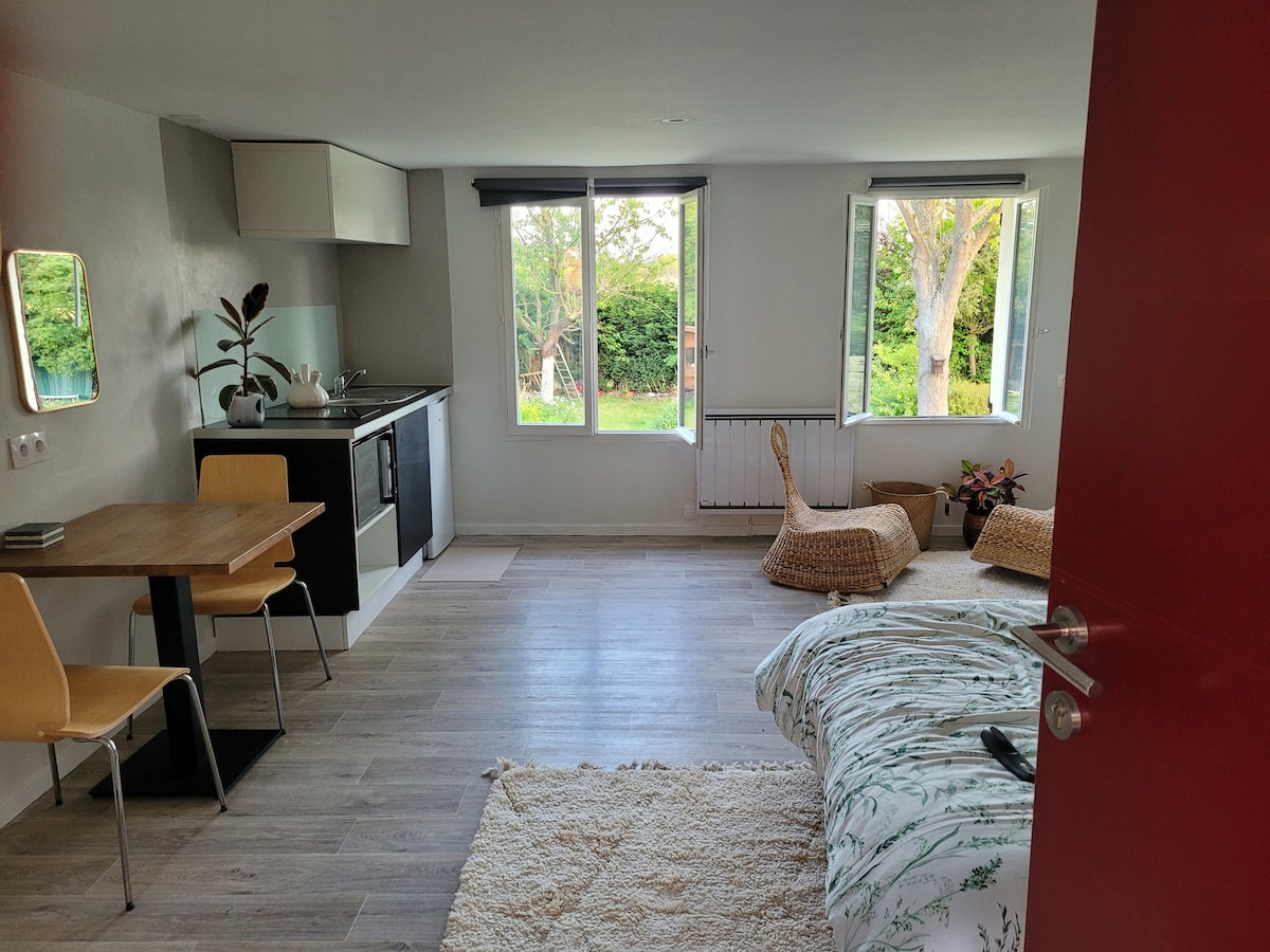 Somptueux studio de 40 m² baigné de lumière naturelle, situé dans un cadre idyllique verdoyant entouré d'un magnifique jardin. Tanquillité d'un domaine privé unique dans la région, au cœur d'un vaste parc naturel, de golf d'un côté et du Lac du Héron de l'autre. Lit queen size 160x200 de qualité, confortable sofa, kitchenette, salle de bain moderne, WC. Terrasse privée 12 m² en pleine nature. Appartement autonome, accès indépendant, parking gratuit. Excellent débit Wi-Fi pour le télétravail.