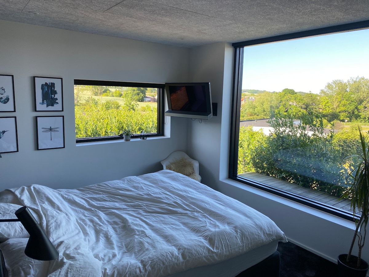 Dejlig ny renoveret staldbygning med synlig bjælker og højt til loftet. Et stor køkken alrum med ovn, stor spisebord,sofa gruppe, fodboldbord og dobbeltseng. Stor hems med 2 enkelt senge. Dejligt nyt badeværeske med brus. Udgang til stor træ terrasse med fantastisk udsigt, her er mulighed for at grille og nyde en tur i vildmarksbadet. Belligende få km. til indkøb og badesø, samt tæt på skov. Kort afstand til Århus og Silkeborg, offentlig transport hertil fra Låsby hver time.