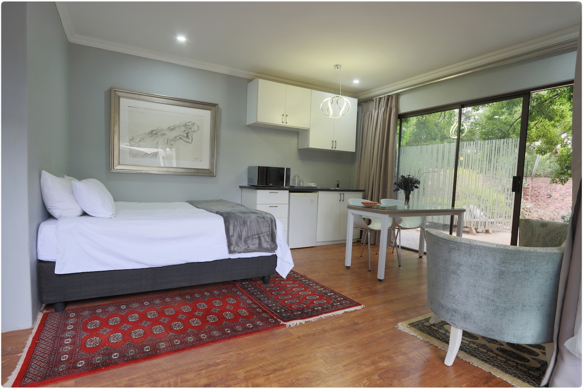 Newly renovated flatlet with private outside terrace on a shared property in the lovely boomed off area of Waterkloof Glen. Featuring 1 spacious bedroom, 1 bathroom with shower. Open plan kitchen/living/dining room area. Living room provides a sleeper couch – ideal when travelling with a child. Designated parking shared with main house. Suitable whether you are travelling for business or leisure.