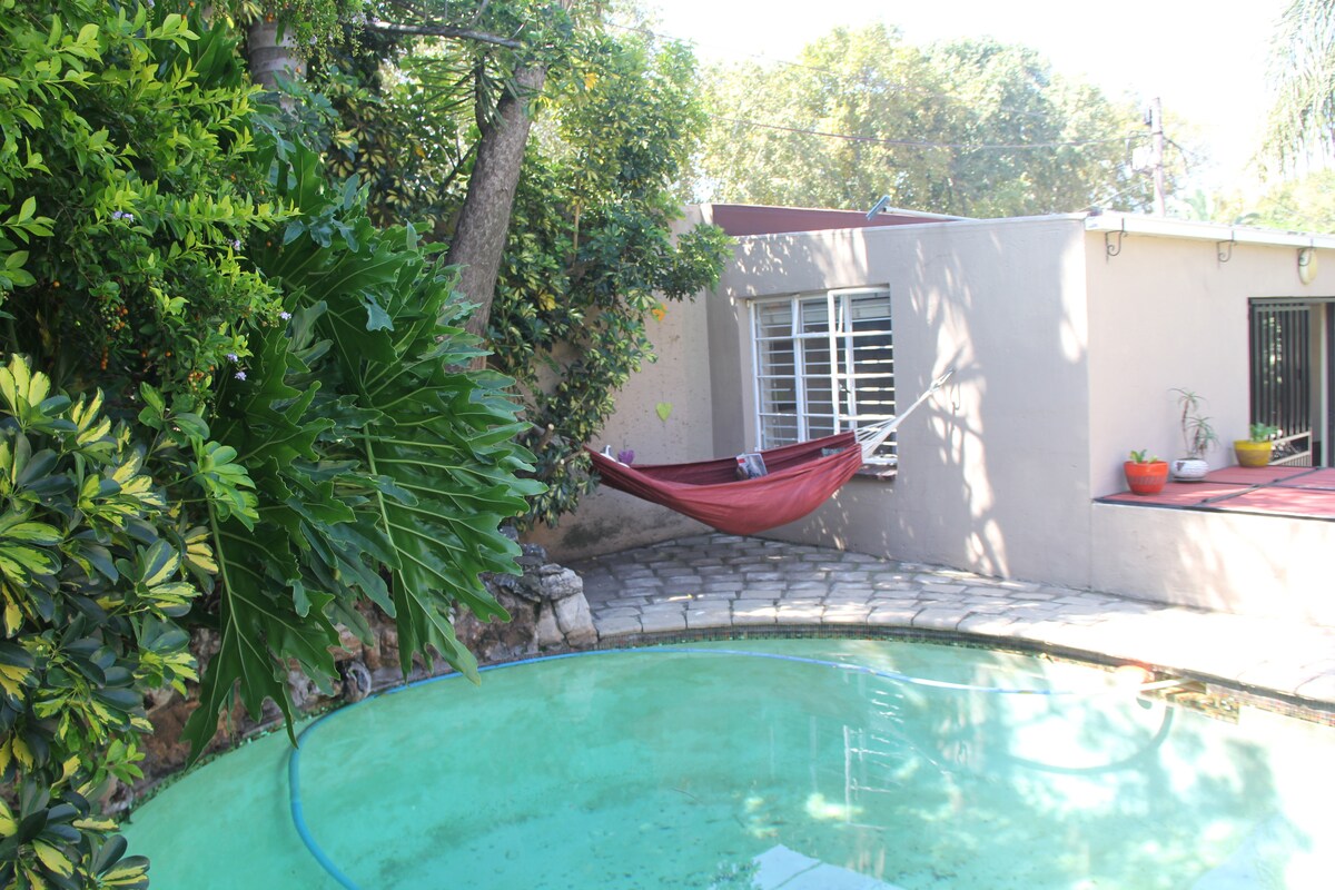 Recently renovated cottage by the pool with double bed with lounge area and a private braai area, kitchen, sofa bed and work station. ✔ Pool next to lush garden ✔ 50Mpbs+ WiFi ✔ Smart TV with Netflix ✔ Shaded parking for two vehicles ✔ Work space with ethernet connection ✔ Washing machine ✔ Dishwasher ✔ Fridge ✔ Gas Stove ✔ Microwave Oven ✔ Fully loaded kitchen utensils. Situated in a central location and close to all amenities. Suitable for three people. Suitable for long term stay as well.