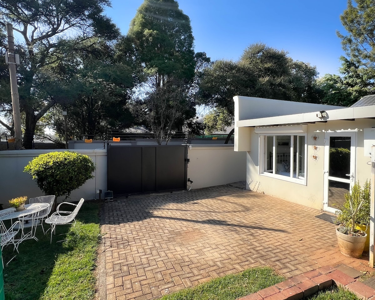 Whether on a business trip, relocating, or holidaying, this centrally-located, quaint, cosy, fully furnished, modern garden apartment offers more space and privacy than you would find in any hotel. It's comfortably furnished with a super-king bed, modern kitchen with washing machine and drier. The spacious bathroom boasts both shower and bath. Add a cosy private patio with braai in lovely garden, WiFi, Smart TV, DSTV & UPS inverter and you're right at home! Just 10 min from OR Tambo & Sandton.