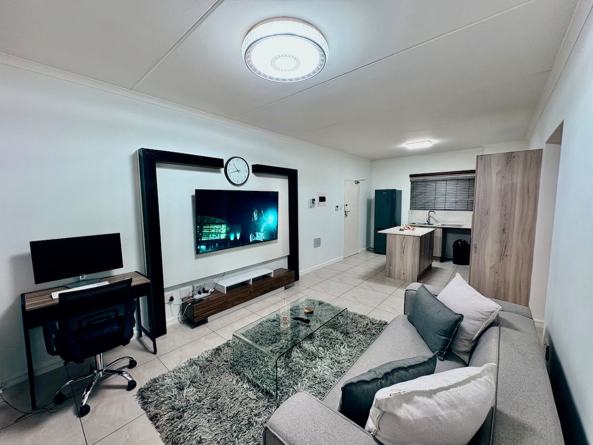 This up market unit is perfect for a home away from home. Lock up and go, secure safe suburb , set in beautiful garden. Easy access to Highways. Comfortable King size bed for great nights sleep. Suitable for short or long term rental, staycation, celebration or business trip. Serviced daily except Sundays and public holidays! Unit comes with one parking bay. Lights, TV and WiFi available during load shedding! Property has a borehole with purified water. Unit has an aircon.
