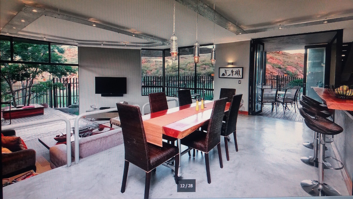 Solar powered battery inverter to escape load-shedding and forget your worries in this spacious, peaceful and centrally located place. A stone's throw from the best restaurants, shopping centres, sports facilities, and hospitals. Let the children play in the jungle gym and lush garden. Relax in the sauna and take a dip in a pool to cool down. Exercise at the gym and play pool. We look forward to welcoming you to our perfectly hidden getaway in the middle of bustling city landscapes.