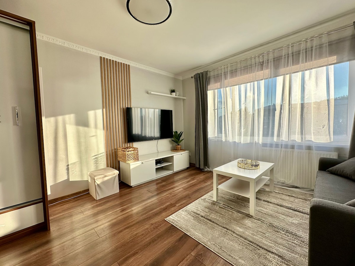 The apartment is composed of one bedroom and spacious living room. Living room with kitchen is perfect to relax after long day. Balcony/terrace is perfect for morning tea or coffee. It's is located in freshly developed business area 10 minutes drive to the city centre and 10 minutes walk to a bus or tram station. There is also restaurant, shopping mall and children's playground nearby the apartment. The flat is suitable for couples, families with kids and friends.