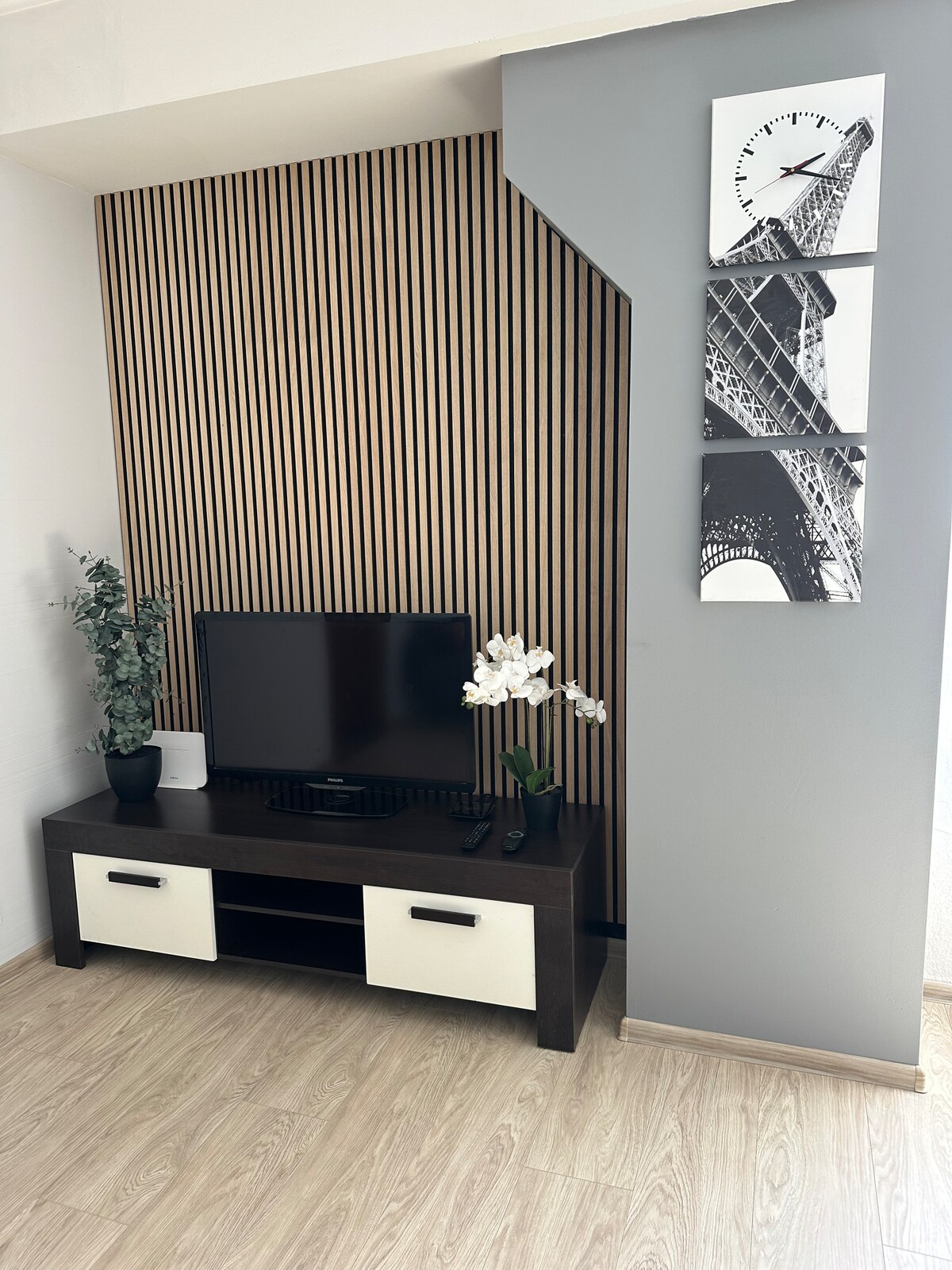 Comfy apartment is located in Jugla district, 1 bedroom with a double bed, and a living room with an expandable couch. Ideal for singles, working expats, couples and a family with 1 child. Fast WiFi. Kitchen is accessible from the living room. Bathroom has a WC and a bathtub with an overhead shower. Located on a 5th floor(no elevator). Nearby plenty of grocery stores, a forest area with a lake is a short walk away. Excellent public transport lines to the center. Car parking in the area is free.