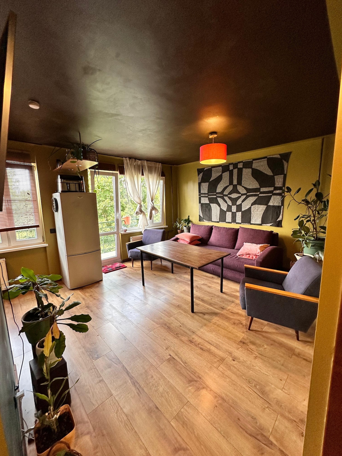 This modern 1-bedroom apartment (46 m²) is the perfect spot for travelers looking for comfort and convenience. Located in a quiet neighborhood just a short ride from the city center, the flat has everything you need — a fully equipped kitchen, a living room, a comfortable bed, and plenty of natural light.