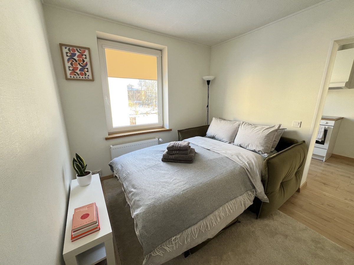 Apartment is placed just one stop to the huge shopping mall Alfa. Tram and bus stops are just infront of the building(Meža Skola stop) goes directly to the center. Apartment is 25 skv.m., placed on the 1st floor. 1-2 people will feel very comfortable, but for short term there is extra folding sofa size 140X200 which can fit more 1-2 people. Apartment includes everything for living, like bedsheets, towels, kitchenware. Washing mashine is with drying function. Can provide baby chair and etc.
