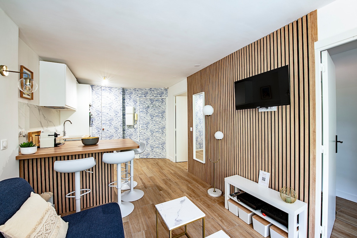 LUX Art Very bright modern studio renovated in 2022, 34 m2 with a large terrace, with stunning sea views. In a very quiet place where you can hear the birdsong! It is located in the beautiful Jardins d´Elisa, on the border with Monaco. The Residence has an underground parking with video surveillance! Ideally located 100 meters from Monaco Boulevard de Mulan 5 minutes walk to Larvoto beach and Grimaldi Forum.