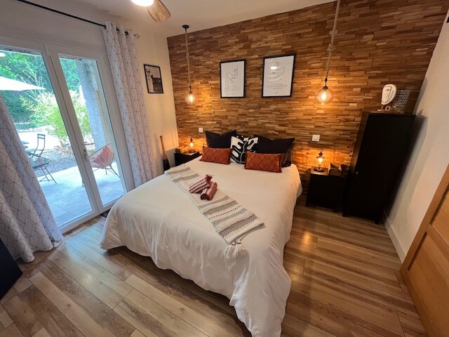 1 bedroom suite with private deck and jacuzzi (open all year), out of sight. Breathtaking views of the village of Le Plan de la Tour, the hills and San Peïre. Ideal for travelers looking for a change of scenery and nature. Far from the hustle and bustle of city life, this is the perfect place to unwind. Outdoor plancha available. Breakfast included and served every morning on the terrace.