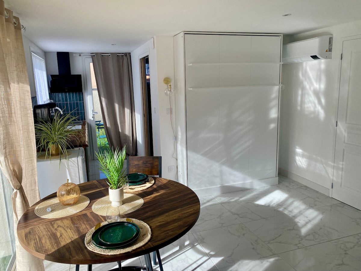 Coconfort is a bright and elegant apartment in a lush green setting. 27 m² (290 sq ft) fully renovated: - Separate, fitted kitchen. - Dedicated sleeping area with storage and a small office, elegantly separated from the living area, which benefits from a terrace overlooking the residence's grounds. - Bathroom with toilet, shower, and washing machine. Bed made, one towel provided. This quiet ground-floor apartment does not overlook the street. Easy and direct access with secure private parking.