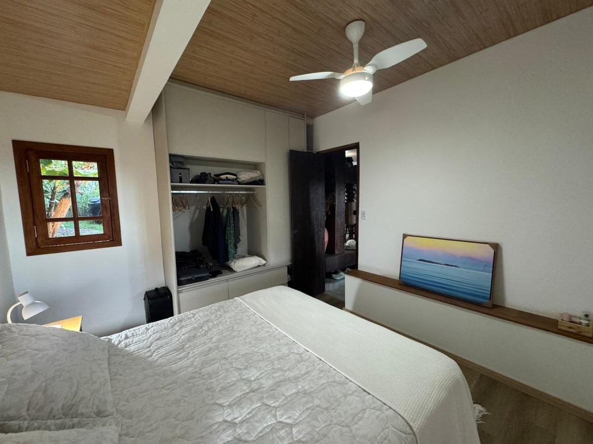 Chale charmoso em uma das melhores localizações da Praia do Rosa: a poucos minutos da praia e do centrinho, em um vale cercado de natureza com toda a tranquilidade e segurança . A casa é toda equipada (cozinha, ventiladores, estacionamento, etc) e decorada com charme para seu conforto , além de desfrutar da piscina de água corrente natural, quadra de areia de praia , churrasqueira etc...