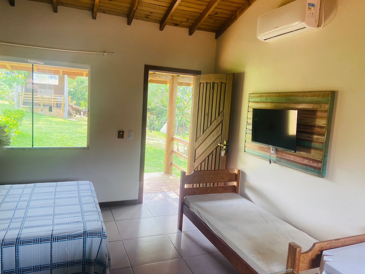 O chalé fica no alto do morro com vista mar entre as árvores. A casa tem Ar Condicionado, cozinha completa, sofá, rede, banheiro privativo, quarto com colchão Queen no mezanino, vista pro mar e morros, além do espaço comum da pousada com churrasqueira, forno de pizza, sala com lareira, sofá, mesa e varanda com uma vista mar incrível. Localização (Praia do Siriú) - 1,3km do mar da Praia do Siriú - 9km do centro de Garopaba