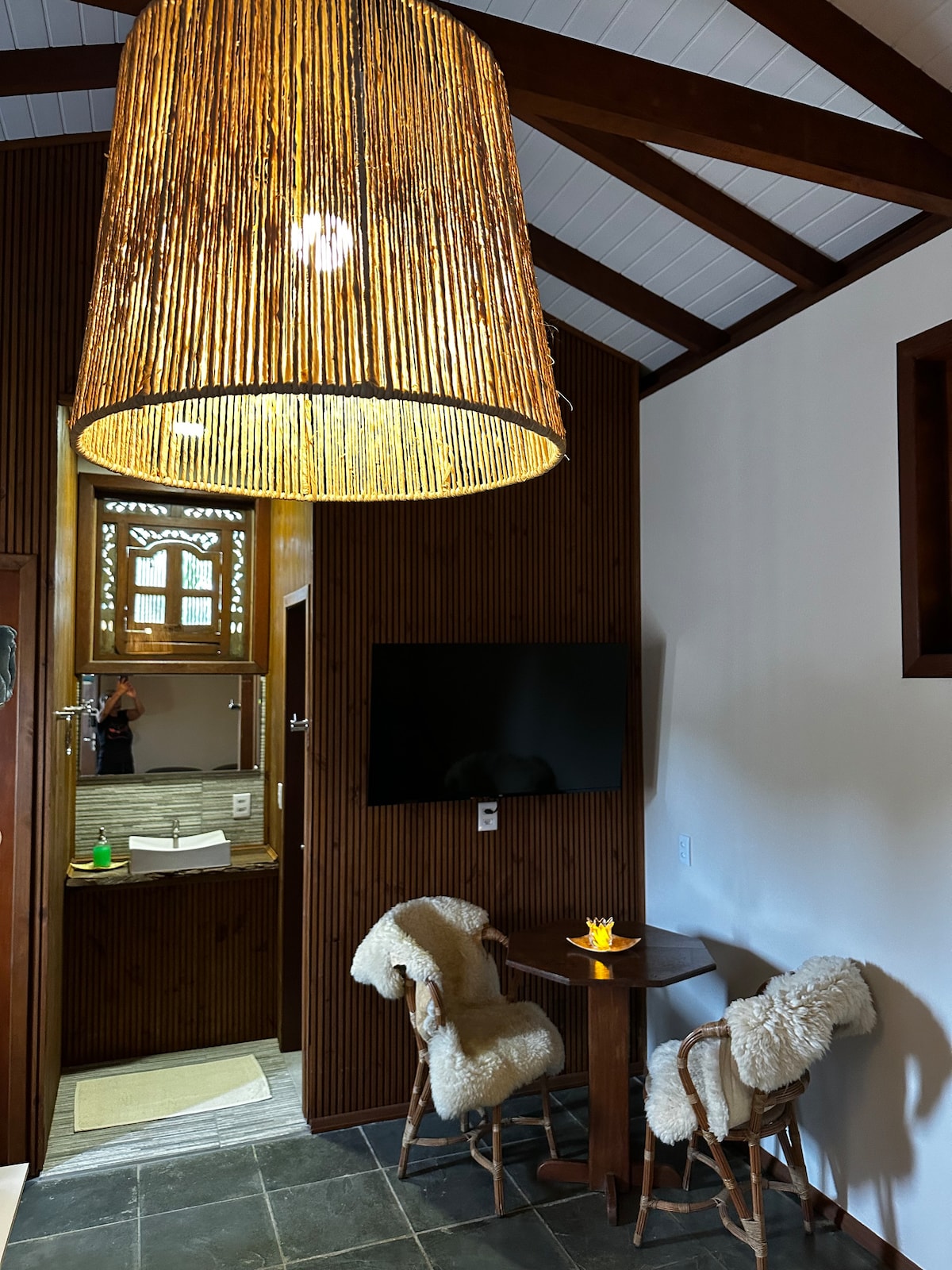 Suíte com cama de casal, roupa de cama, ar condicionado, TV 50", armário, mesa, cadeiras e amplo banheiro com chuveiro, pia e sanitário em ambientes separados. Possui microondas, cafeteira, chaleira elétrica, frigobar além de louças e talheres para refeições rápidas. Não há fogão. Possui estacionamento para 1 carro pequeno. Localização: - Na rua principal do centrinho do Rosa - 1,3km da Praia do Rosa - 3,4km da Praia do Ouvidor - 15km do Centro de Garopaba - 17km da Praia da Ferrugem