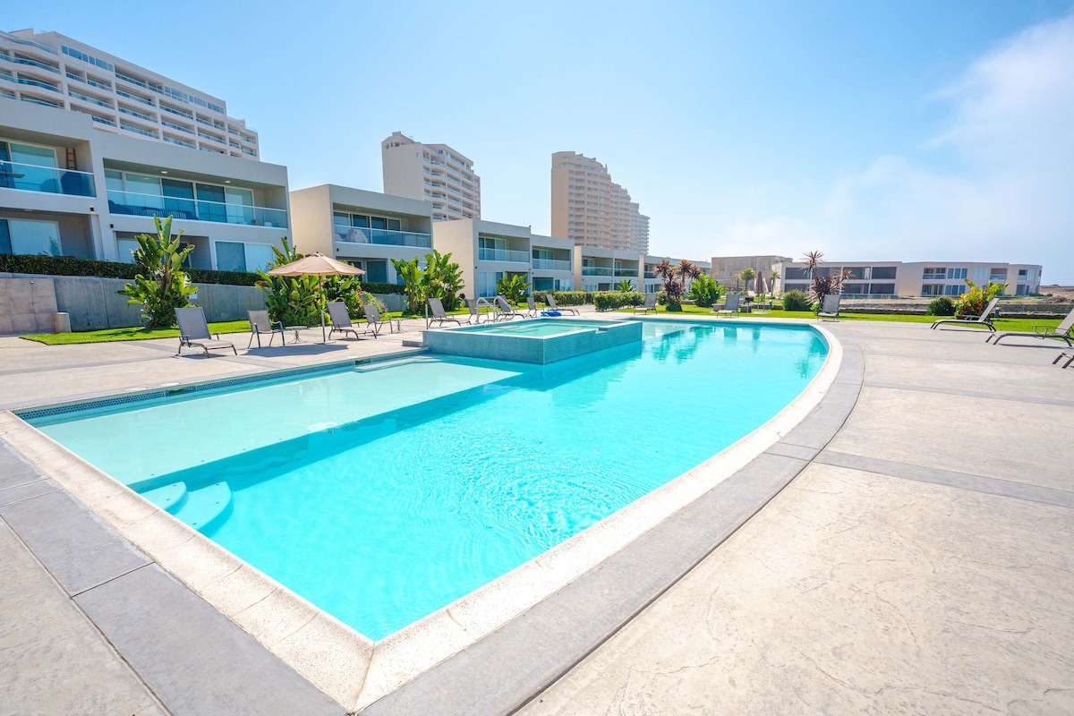 Discover the ultimate oceanfront retreat at Las Olas Grand. Just 45 minutes south of Border and 10 minutes from downtown Rosarito, our exclusive complex offers relaxation and adventure. Let the soothing sound of the waves and breathtaking ocean views transport you to serenity, as you watch dolphins glide by on their daily swim. Unwind in our ocean-view pools, jacuzzis, and scenic terraces, the ideal setting to create unforgettable moments with family and friends. Your coastal escape awaits! 🌊✨