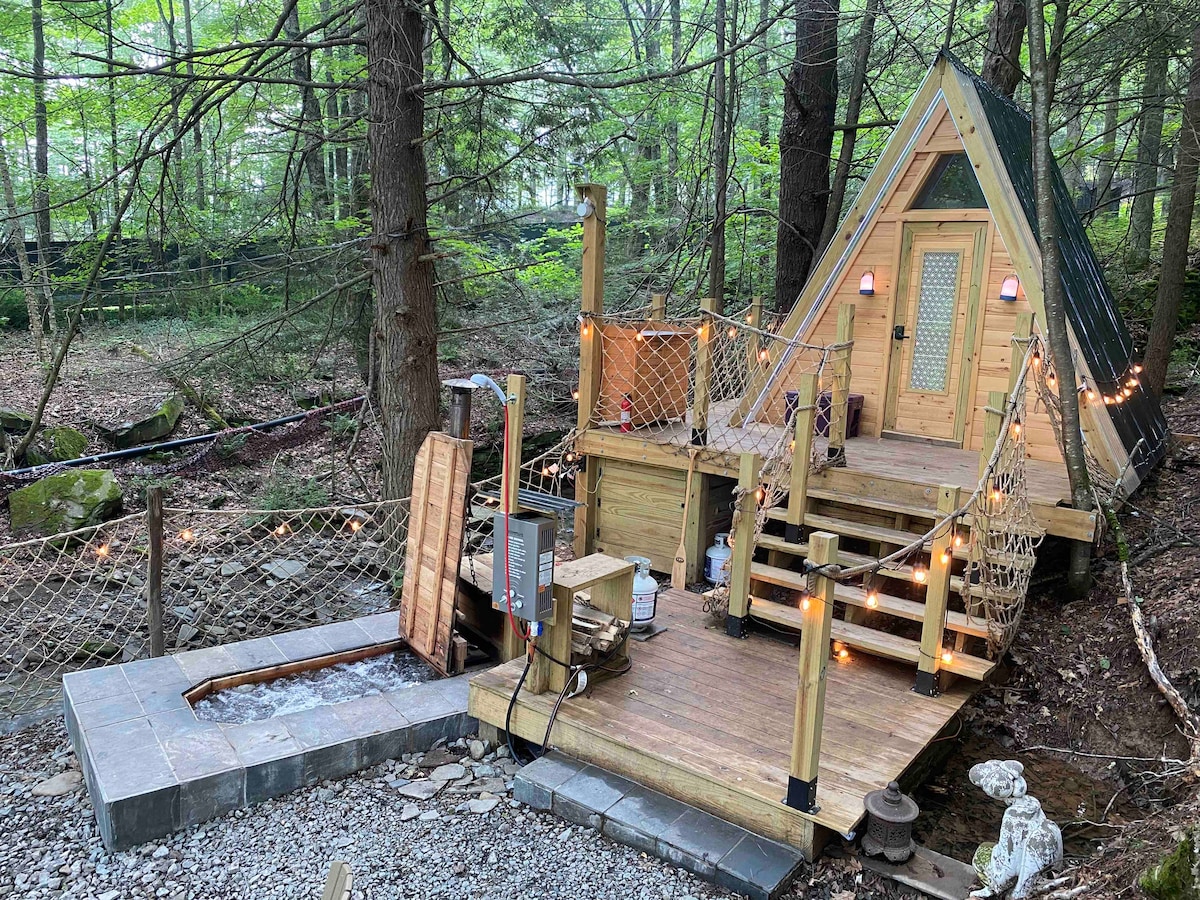 This off grid, alternative powered site is located towards the front of a large twelve acre estate, alongside a flowing brook. Elevated over a natural spring that flows year round, the Japanese inspired aesthetics of this private, tiny cabin sits perched atop a deck among the wooded trees overlooking the waterway the mineral spring feeds, but not before filling the in-ground, cedar lined, two person, bubbling hot tub heated with a wood burning stove. One of two glamping sites on the 12 acres.