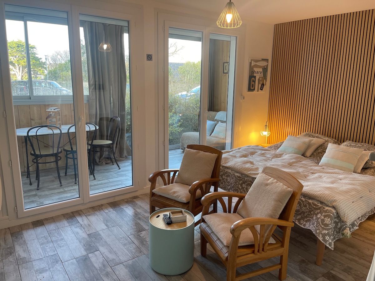 Studio à 50m de la plage de sable fin, pavillon bleu d'Europe Sentier des douaniers à 200m GR34 Place de parking privée Commerces à 400m: poste, superette, presse, boulangerie, pharmacie.. Restaurants le long de la plage Très bien équipé Il y a des volets sur les 2 portes , celle d'entrée ainsi que celle du balcon, un volet à la fenetre de la cuisine et au velux un store occultant Je ne fournis pas les serviettes de toilette.