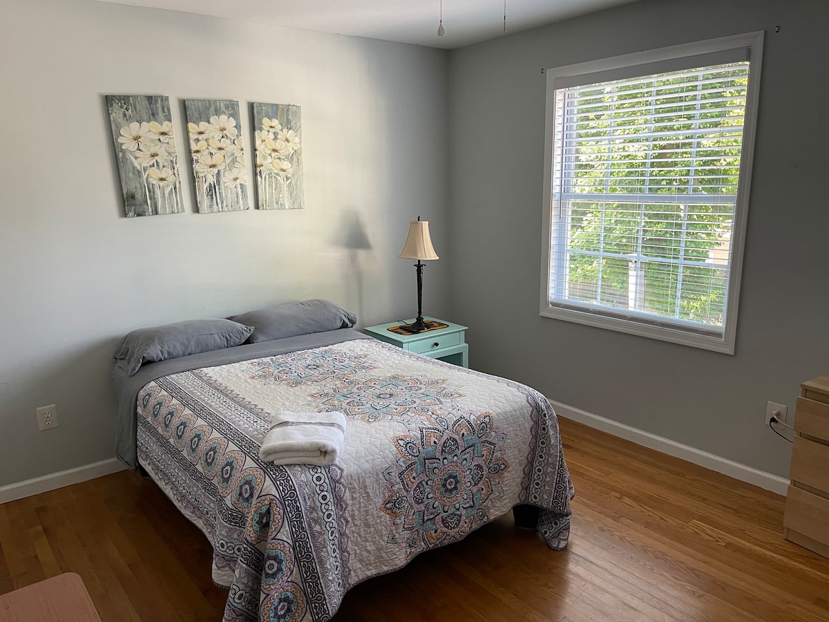 Kick back and relax in this calm, stylish spot. After a long day of exploring, it's the perfect place to unwind. Picture yourself in a beautiful outdoor space, surrounded by towering trees and a cozy fire pit. This space is in the lower level of a split level house & I have 3 children (10, 11, 19) & 2 dogs so you will hear some sounds during the day. You also have your own private patio & you will be able to reserve 2-hours a day in our backyard pool & pavilion area, based on availability.