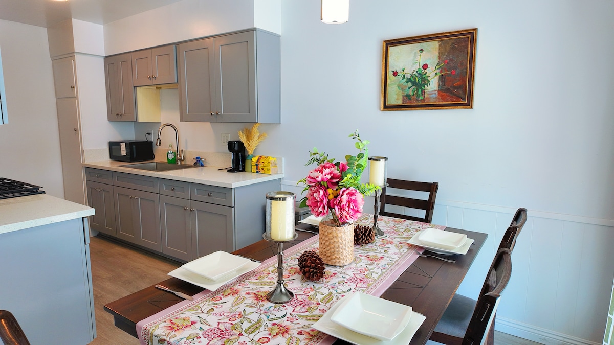 This 1-bedroom/1-bathroom house is 15-20min drive from Dodger Stadium. Built in the early 1940s, its decor is a nod to that era's timeless charm. Blackout drapes enhance the sleeping areas for a restful night's sleep. The beverage bar features ample cabinetry, an accent wall with backsplash, and unique open live edge shelves, crafted from the old avocado tree that once graced the patio. The patio has since been transformed with outdoor furniture, making it perfect for leisurely moments outdoors.