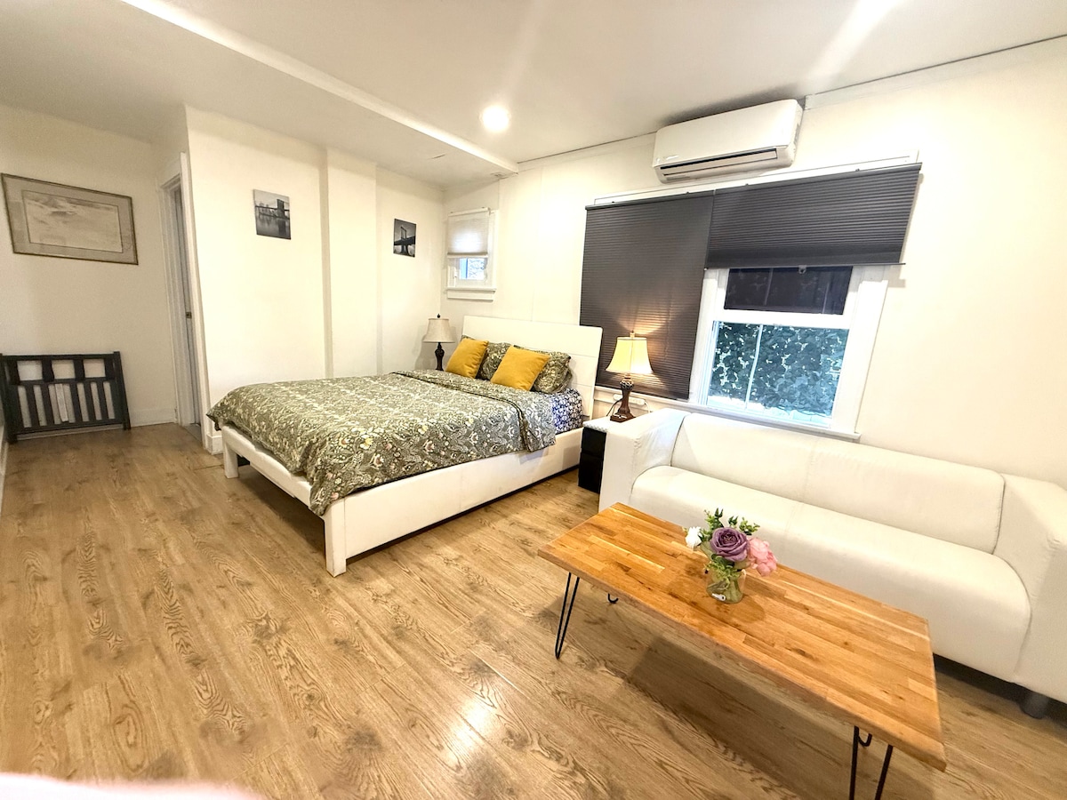 Quiet and cozy standalone guesthouse with private entrance and self check-in. No contact with other guests, no spaces are shared — everything is entirely for your private use. Features a queen-size bed ideal for couples, an additional sofa bed can be provided for the third guest to sleep on. A/C and heating, work desk, fan, and smoke detector. Enjoy a private kitchen for light cooking, a walk-in shower, and blackout curtains for restful sleep. Large windows provide plenty of natural light.