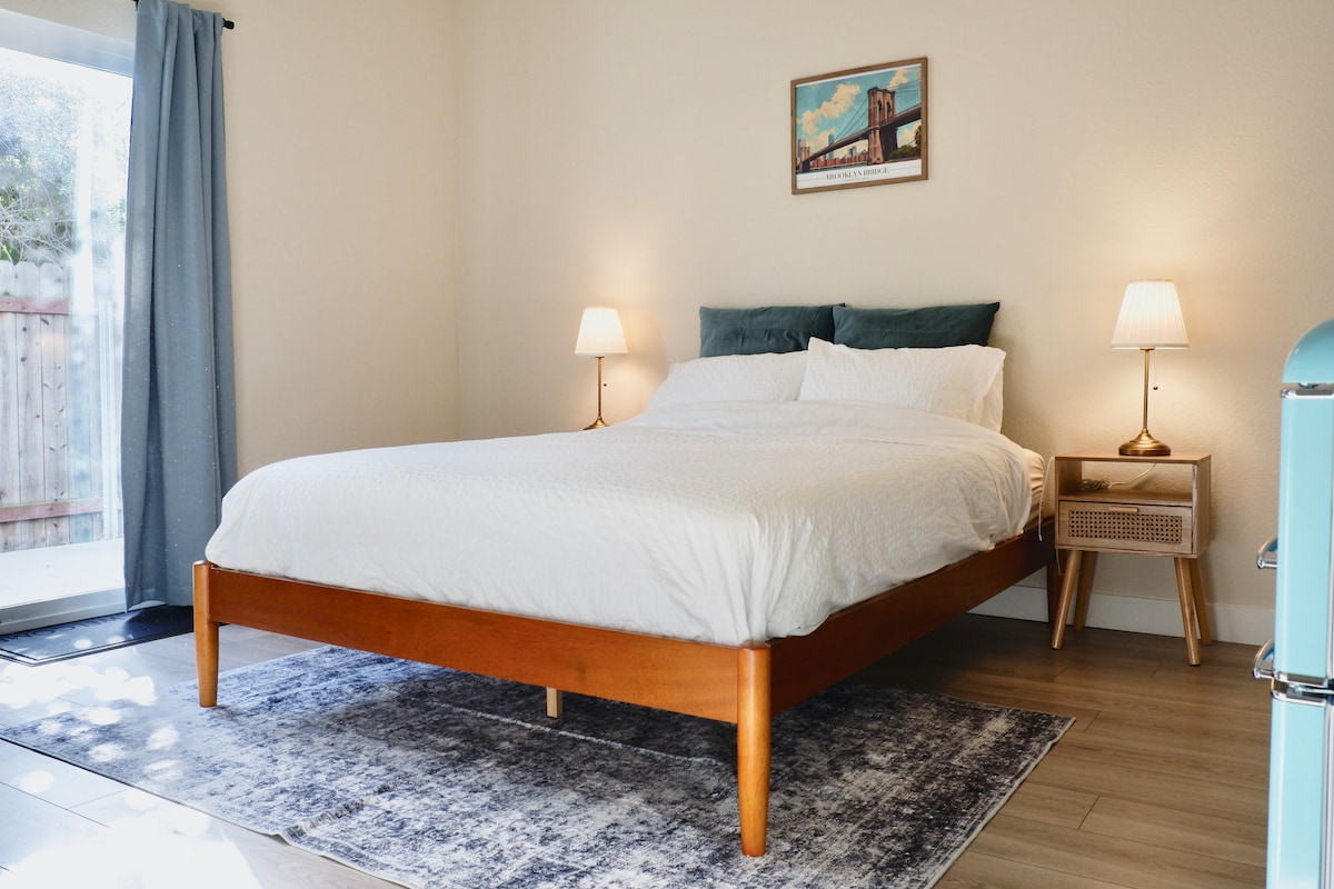 Unwind in Mariposa Cottage, our cozy one-bedroom guesthouse, nestled in a safe, central, and family-friendly Sacramento neighborhood. Just one block from Colonial Park—a 2+ acre community space with a playground, kiddie pool, picnic areas, and sports facilities—you’ll find plenty to enjoy nearby. Only 12 minutes to downtown/midtown’s restaurants, entertainment, and activities, and minutes from UC Davis Medical Center, grocery stores, and more.