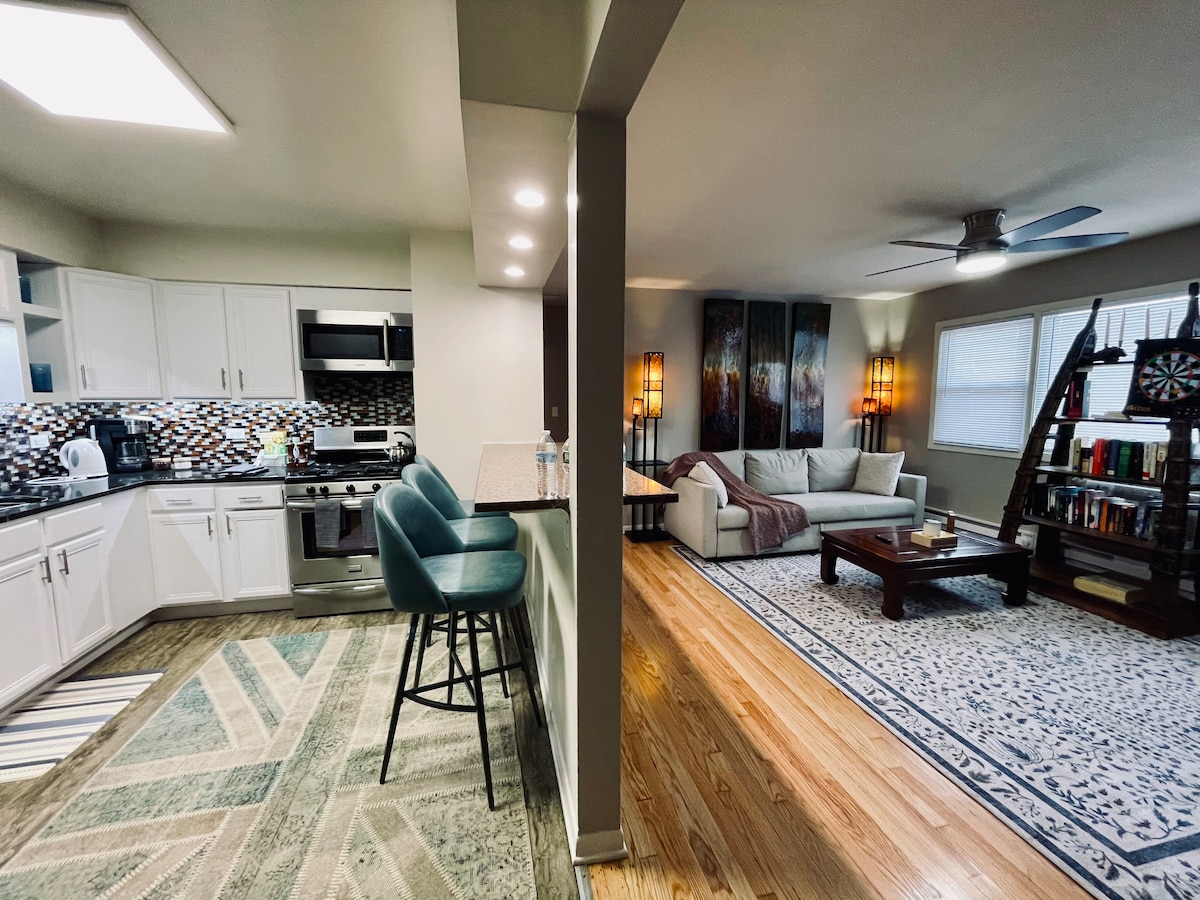 Freshly Remodeled , Lower Level garden apartment one bedroom one bath. Older building with wooden floors. If hearing people upstairs walking can bother you , do NOT book it please .Very Spacious with its open concept layout. Parking is right next to the main entrance of the building. 24/7 perimeter monitoring cameras. The Condo is very close to the Metra Train. It is !5 min away from O'Hare airport and 10min to outlets Absolutely NO parties, NO gathering Quiet hours 10 pm till 6.00 am