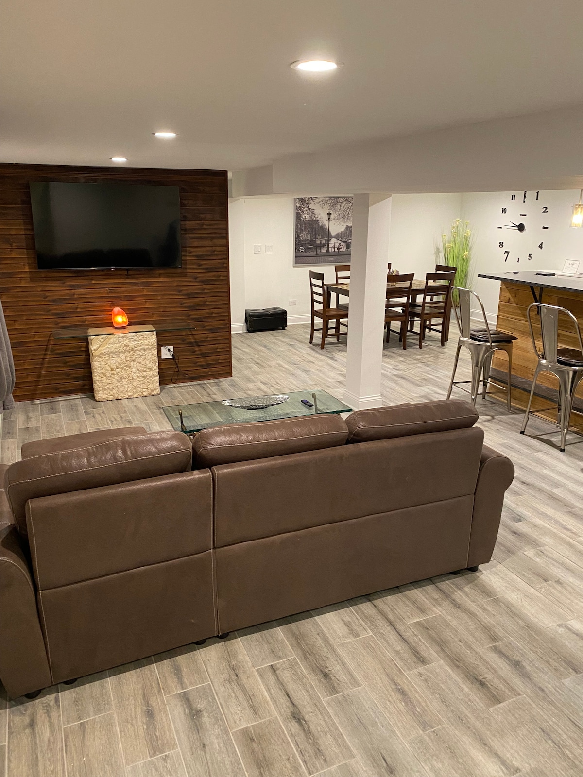 Clean and well appointed lower level of owner-occupied home with private in/out access separated from the main level. The suite-style space includes a generous living area with two large couches, 49” smart TV w/ sound system, king bed, full bathroom, kitchenette w/ table, washer/dryer & work desk. Great location 5-10 minutes from O'Hare, Allstate Arena, Rosemont and Rivers Casino with ample transportation options. Property is within short walking distance of grocery stores, gym, parks & more.