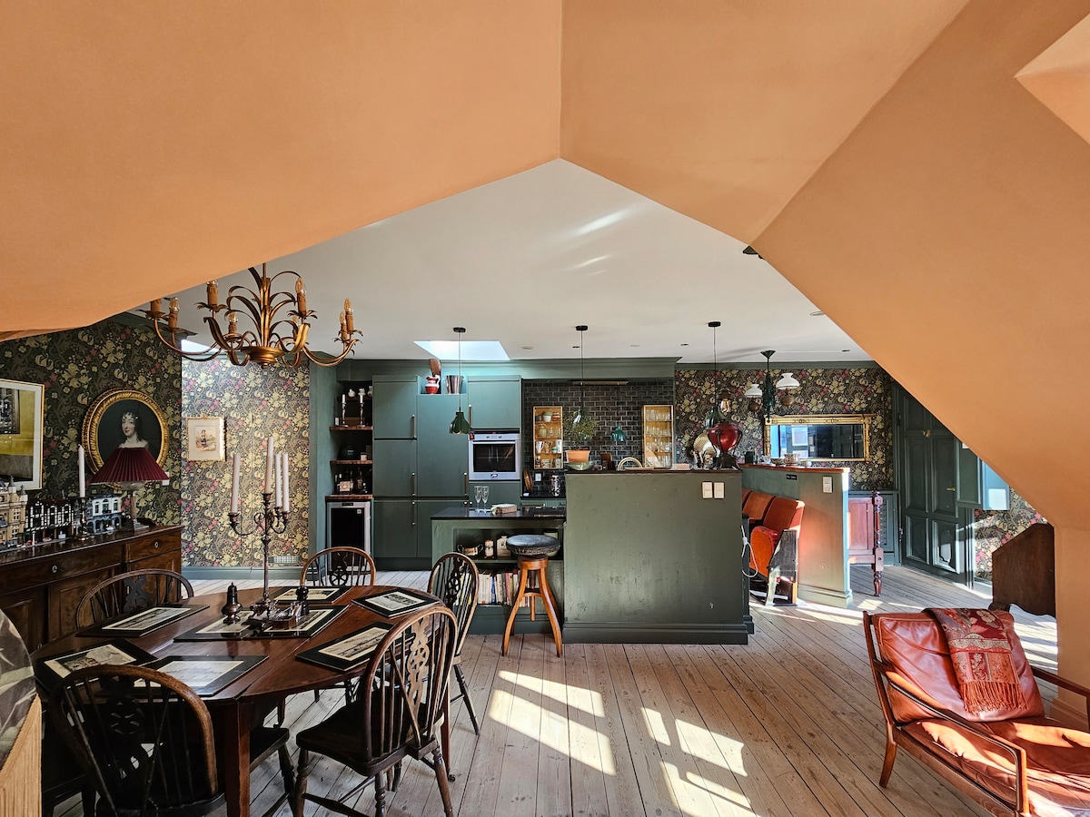 Unique and magnificent private apartment in an unbeatable location at the heart of Inner Copenhagens middle age area. Your own “town house” with a private entrance from a quit sidestreet. A high-end luxury spread over 140 sqm, you stay in a fusion Art Gallery luxury apartment Design furniture, hand built kitchen, wooden floors. high ceilings, contemp. art. Historic estate built in 1789 once a theater This place is also perfect for business meetings / work stays of longer or shorter periods