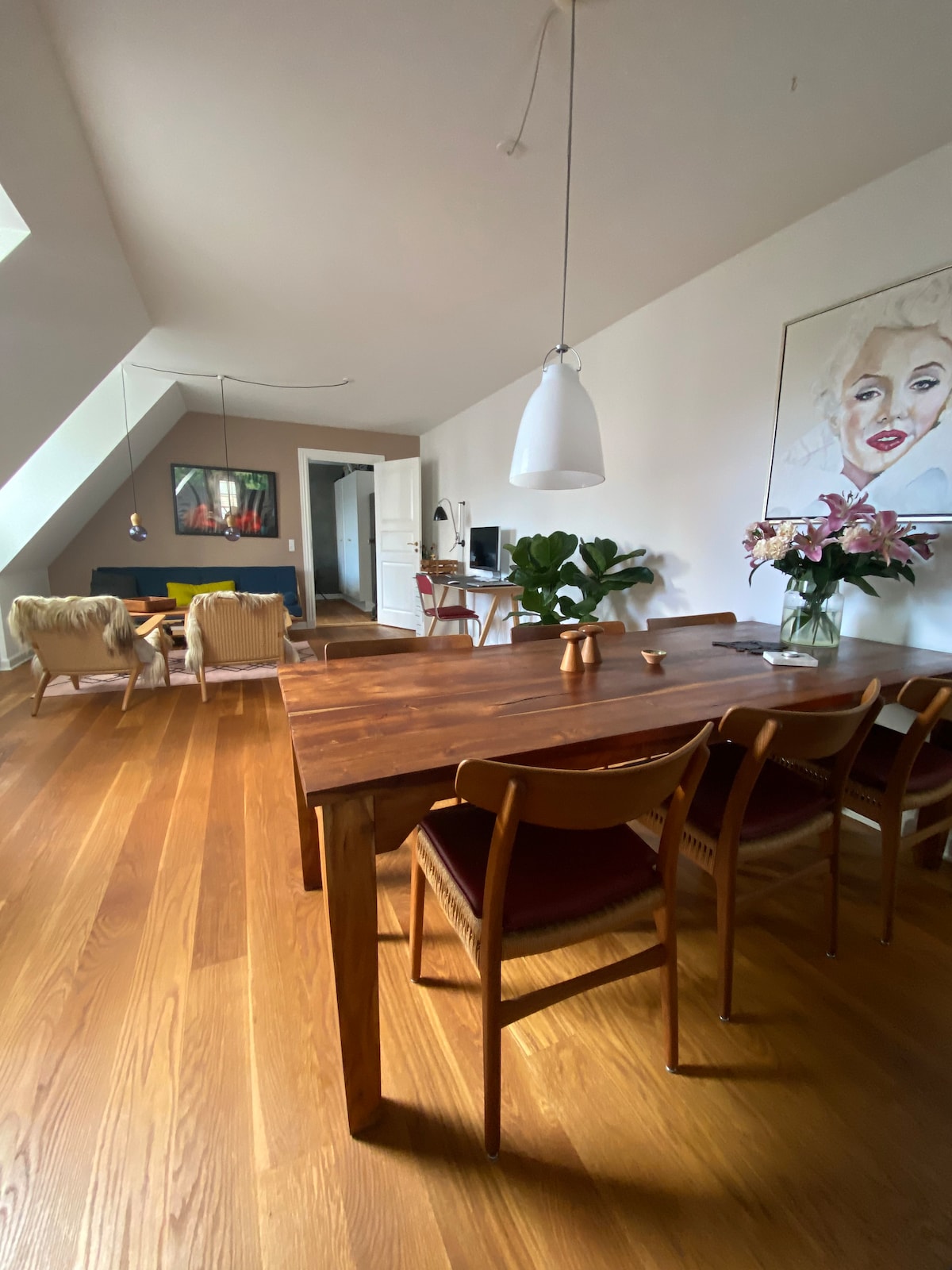 Unique and magnificent private apartment in an unbeatable location at the heart of Inner Copenhagens middle age area. Your own “town house” with a private entrance from a quit sidestreet. A high-end luxury spread over 140 sqm, you stay in a fusion Art Gallery luxury apartment Design furniture, hand built kitchen, wooden floors. high ceilings, contemp. art. Historic estate built in 1789 once a theater This place is also perfect for business meetings / work stays of longer or shorter periods