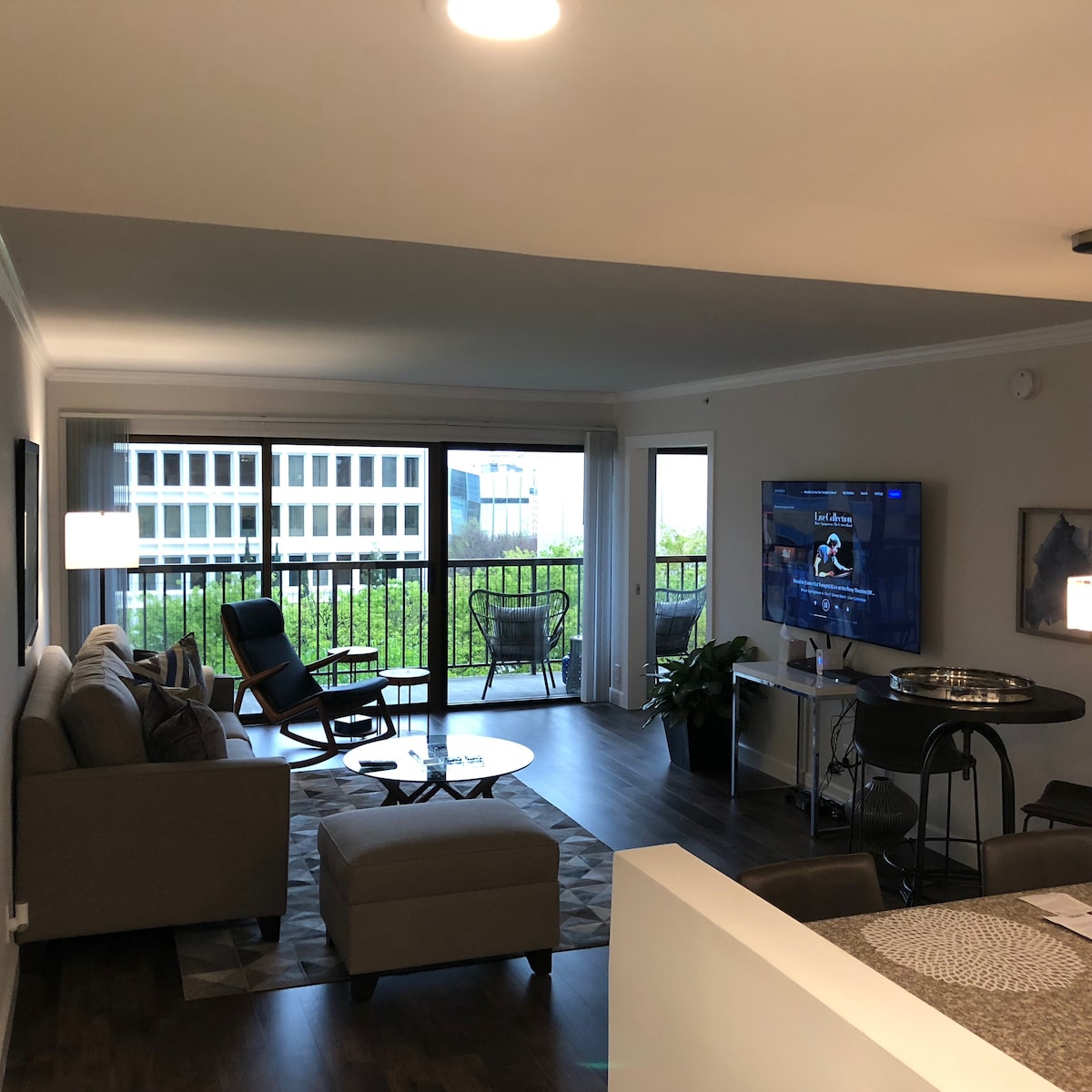 Beautiful fully furnished and stocked executive two bedroom two bath condo With views of the new arena , capital & raley field scoreboard . In a gated secure high rise Walk to everything ... Pool , jacuzzi , sauna , exercise & parking two night minimum We also offer a one bedroom gorgeous newly remodeled completely next door And a second two bedroom above us one floor .. if interested in additional or if this one becomes unavailable . As hosts we are available 24/7 to help and answer any ?s