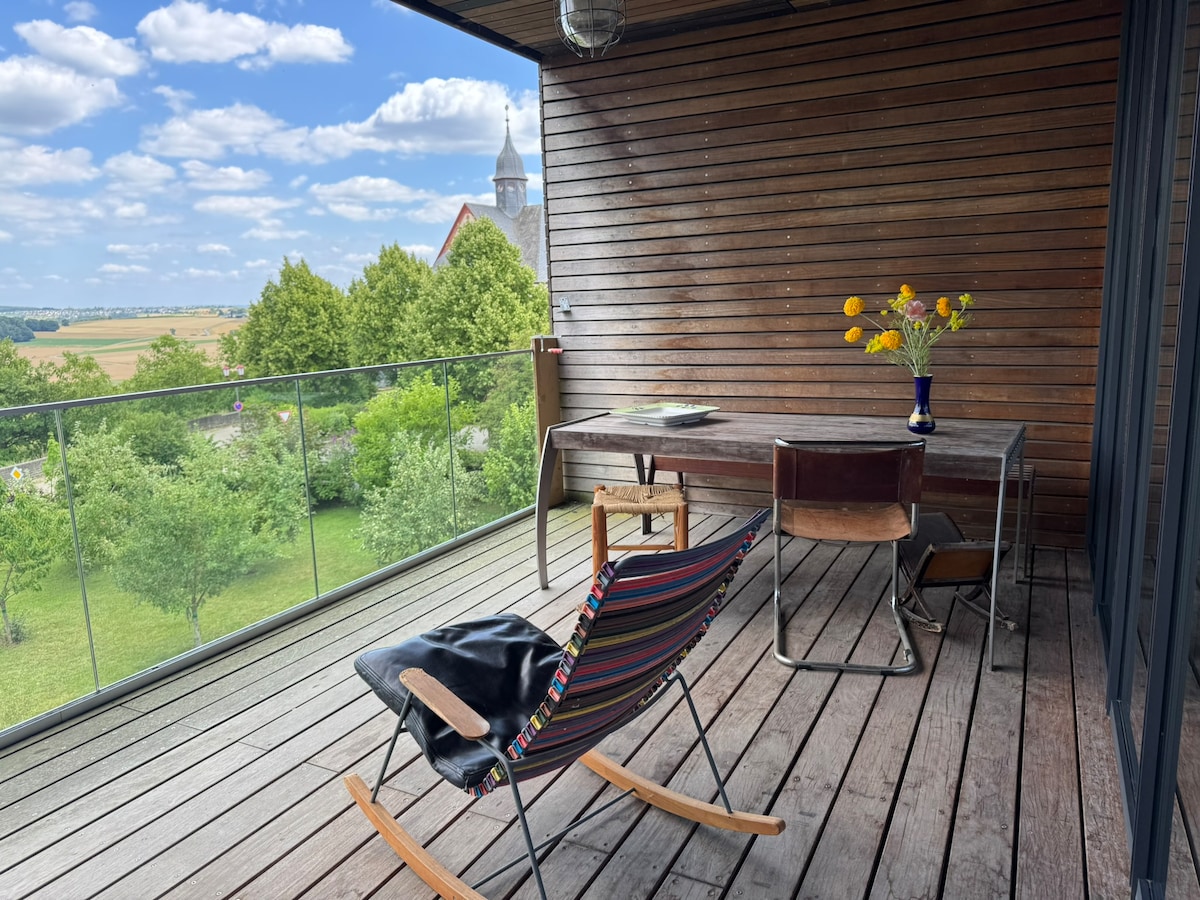 Nehmen Sie sich eine Auszeit in unserem kleinen Ferienhaus in Bollendorf, im Tal der Sauer an der deutsch-luxemburgischen Grenze, im Herzen der Südeifel. Die Wohnung `Fernsicht´, im Erdgeschoss mit ca. 80 m² Wohnfläche verfügt neben einem Schlafzimmer mit Doppelbett, einem geräumigen Bad mit Wanne, einen Wohn- /Esszimmer mit Holzofen zusätzlich über eine moderne Küche mit Vorratskammer. Genießen sie die Fernsicht und den Sonnenuntergang auf Lounge des überdachte Süd-Balkons.