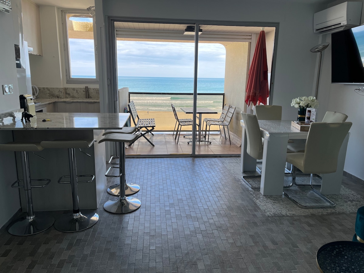 ☀️ Notre appartement situé au 7ème étage avec une vue mer exceptionnelle et panoramique a été totalement rénové et décoré avec goût. Vous pourrez contempler la mer depuis la terrasse, le salon et la chambre. Situé dans une résidence sécurisée au pied de la plage, vous serez à proximité des commodités nécessaires. Il dispose d'une place de parking dans un garage fermé et sécurisé. Il bénéficie d'un équipement haut de gamme permettant de vous sentir chez vous dès votre arrivée.