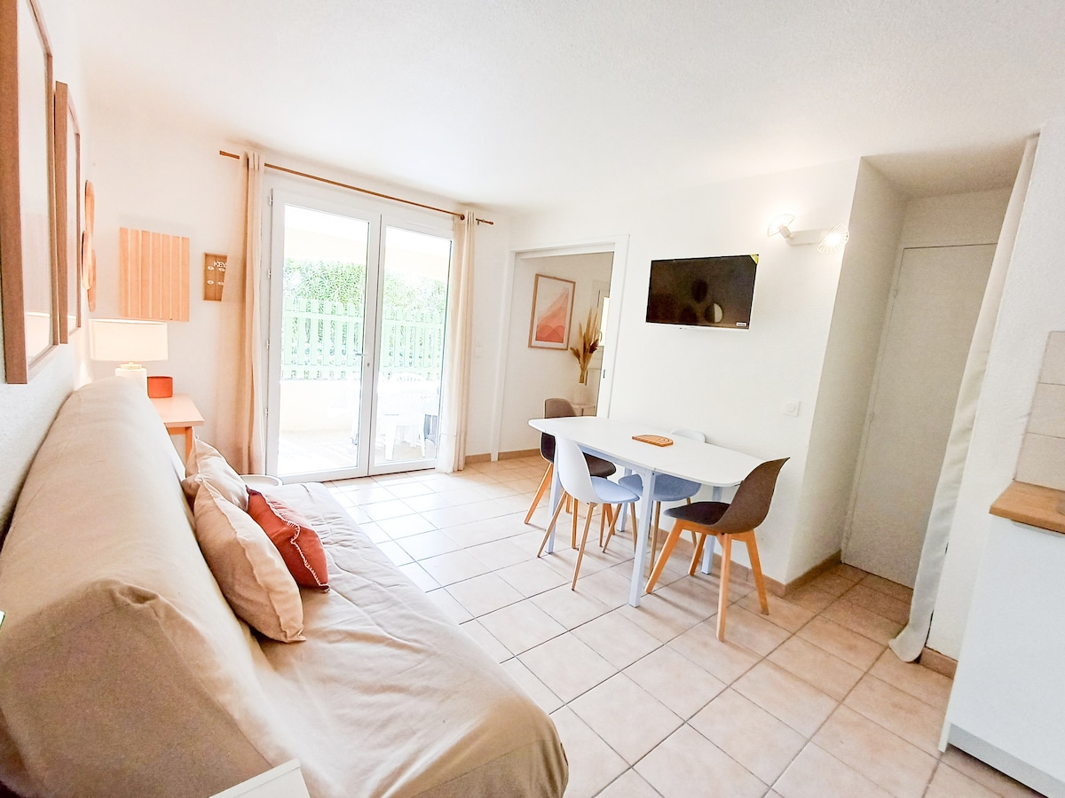 Appartement très agréable dans résidence "Le Soleil Bleu" très calme à 40 m de la plage. L'appartement comprend:salon, chambre à part, salle de bain, cuisine toute équipée:cuisiniére à induction ,four traditionnel et micro onde,2 cafetières classique et senseo. L'appartement est climatisé, équipé de la wifi et d'une place de parking. L'appartement se situe à 40 mètres de la plage avec vue dégagée sur l'arrière pays ce qui permet d'apprécier le coucher de soleil !!