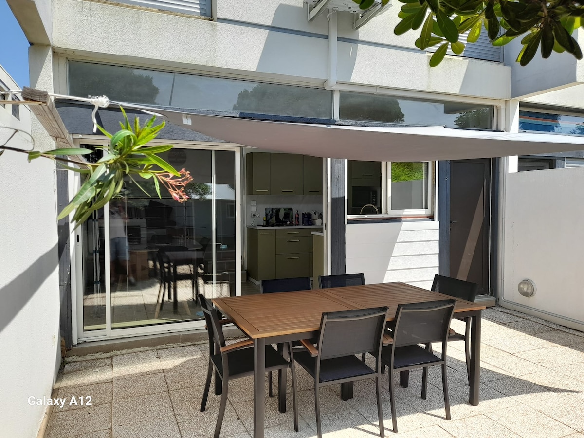 Agréable petite maison dans résidence privée calme avec parking et piscine clôturée et surveillée. Proche de tous commerces a 700 m de la plage, 10 mn à pied. Pièce à vivre salon tv salle à manger, cuisine équipée avec accès direct belle terrasse avec une tonnelle et un barbecue à gaz pour vos déjeuners et dîners à l'extérieur. Au rez-de-chaussée, une chambre avec un lit 2 places, une salle d'eau avec WC. A l'étage, une chambre avec 2 lits en 80 cm et une chambre avec un lit 2 places .