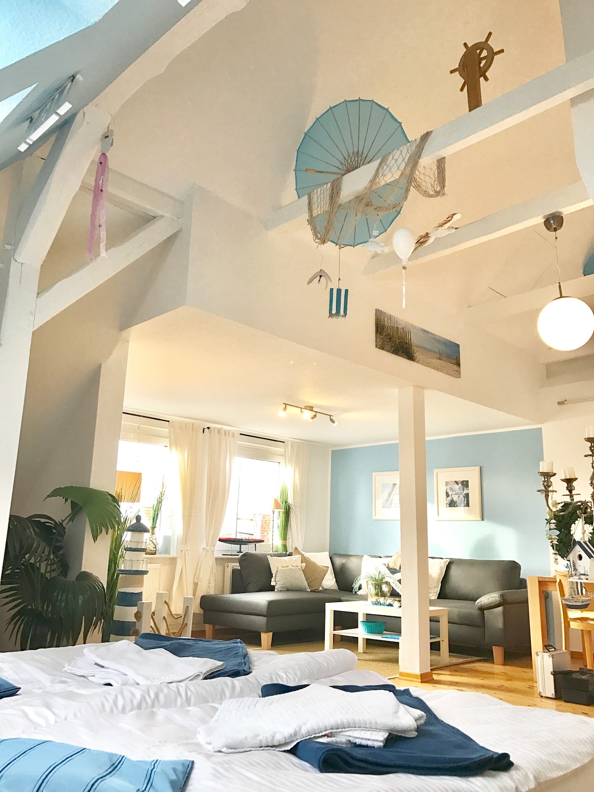 Kleine, gemütliche, praktisch, perfekt gelegene Ferienwohnung in Warnemünde! Lichtdurchflutet, im Dachgeschoss, freut sich auf Freunde der Ostsee - die ist nämlich nur 70 m weit entfernt- aber trotzdem nur 4 Minuten zum Kirchenplatz, dem Herzen von Warnemünde. Da die Couch auch als Schlafplatz zur Verfügung steht, können bis zu 4 Personen dort übernachten- optimal aber für 2 Personen. Für Kinder stelle ich gerne Bett und Stuhl zur Verfügung auf Nachfrage. Hunde sind bei mir immer willkommen!