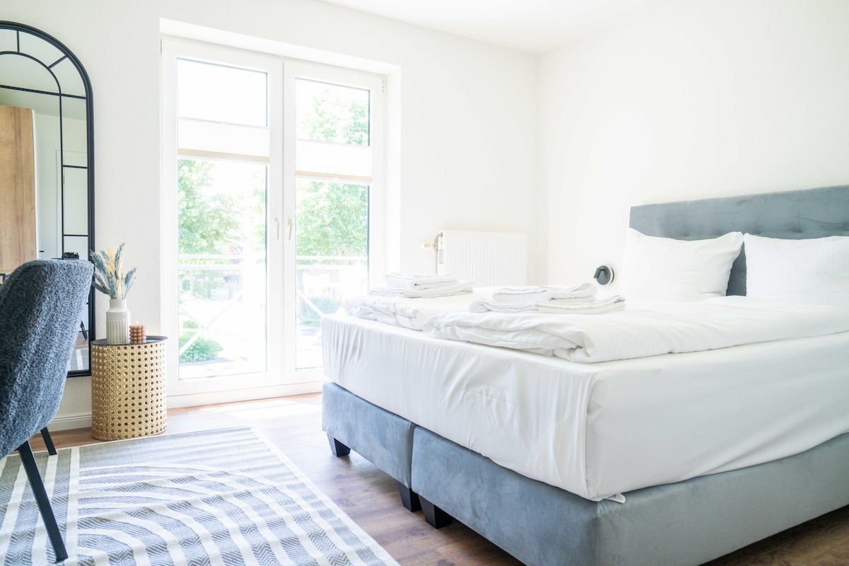 Genießen Sie Ihren Urlaub in der modernen 5 Sterne Ferienwohnung Strandlilie, im Erdgeschoss des denkmalgeschützten Haupthauses der Ferienanlage Zwei Wasser - Seefahrtschule Wustrow. Nichtraucher, 3 Zimmer, Strandhausstil, bodentiefe Fenster, Südterrasse, gut ausgestattete Küche, WLAN, 2 Schlafzimmer, 2 Bäder, Waschtrockner, 530m zum Strand, Fahrradabstellraum, Wellness und Fitness.