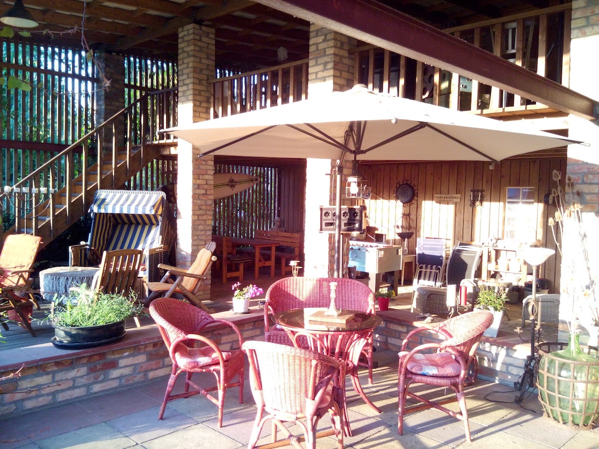 Haus Quitte - A house and garden with history for 8 adults and children. Travel back in time 250 years and let yourself be enchanted by an old thatched farmhouse, renovated to a high standard, surrounded by more than 8,000 m2 of paradisiacal garden with pool, pond and sauna. In the garden you will find many fruit trees to serve, special tree species, exotic roses and many cozy magical places to relax, linger, read and explore.