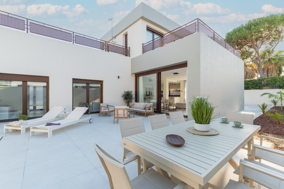 - Ubicada entre Vistahermosa y Puerto Sherry, en la mejor zona de El Puerto de Santa María. - Muy cerca de la zona de ocio: restaurantes, bares, discotecas, supermercados, etc. - Piscina privada y Playa al lado. - Porche, Jardín y Barbacoa. - Casa espaciosa y muy cuidada. - 5 Habitaciones y 4 baños - Hasta 15 huéspedes. - Salón, Cocina y Comedor. - Garaje cerrado para dos coches. - 5 Splits de aire acondicionado y 4 Ventiladores de techo. - Calefacción y Chimenea. - Wifi fibra de Movistar.