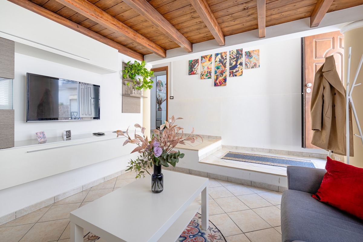 Charming House è situato in una tranquilla zona residenziale nel centro storico dell’hinterland nolano. L’appartamento è completamente indipendente con posto auto esterno. L'appartamento è così composto: •ingresso •soggiorno rifinito con travi in legno a vista •cucina •2 camere da letto matrimoniali di cui una soppalcata •1 bagno completo • 1 bagno di servizio