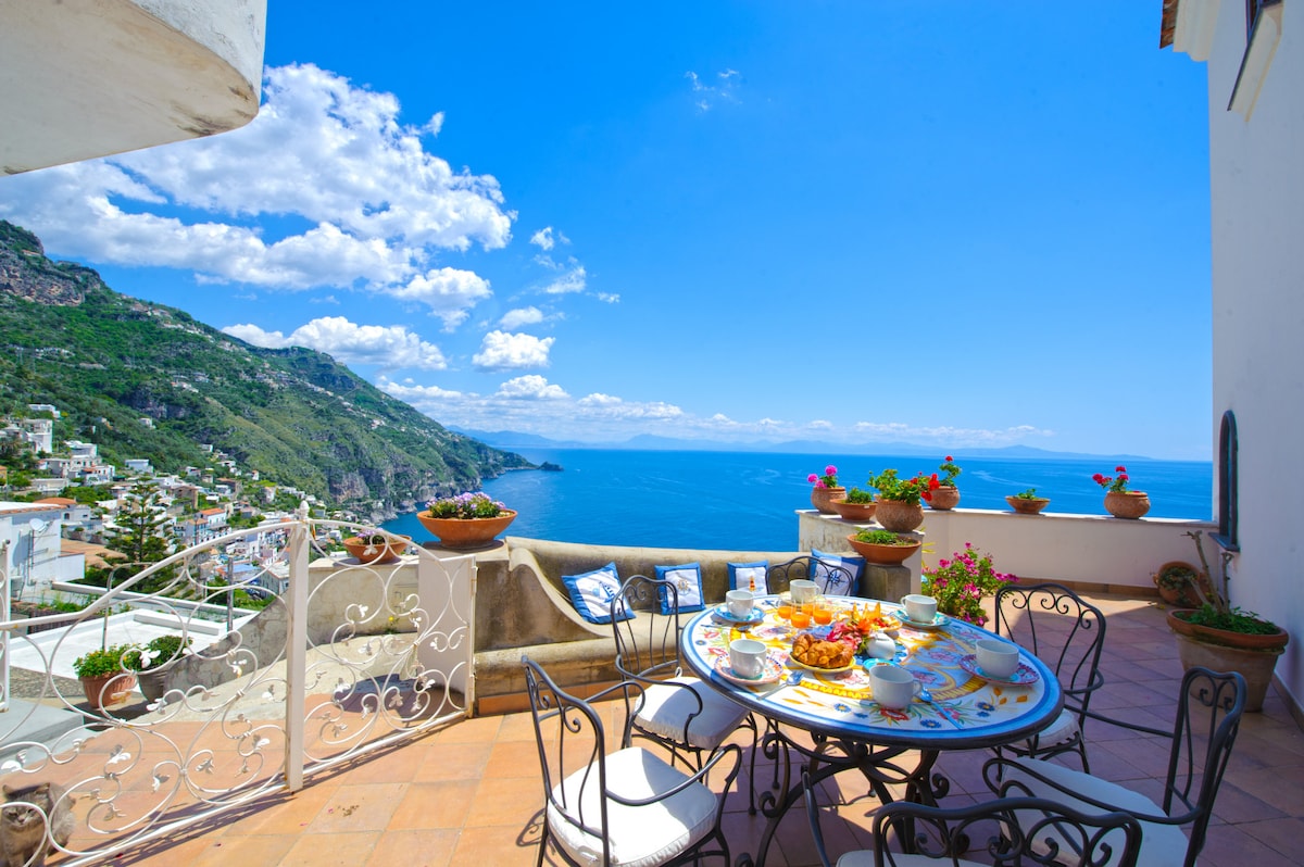An independent portion of a villa in a shady garden, with a breathtaking view. This privileged spot, on a rocky cliff in Positano, between the sea, the mountains, and the country, make this home a special place. the house is surrounded by plants and trees. close to the town center and at the same time reserved and quiet. There are 200 steps to reach it, but the reward is a unique view. The The house has 3 terraces 2 bedrooms, 2 bathrooms, a living room and a full Kitchen