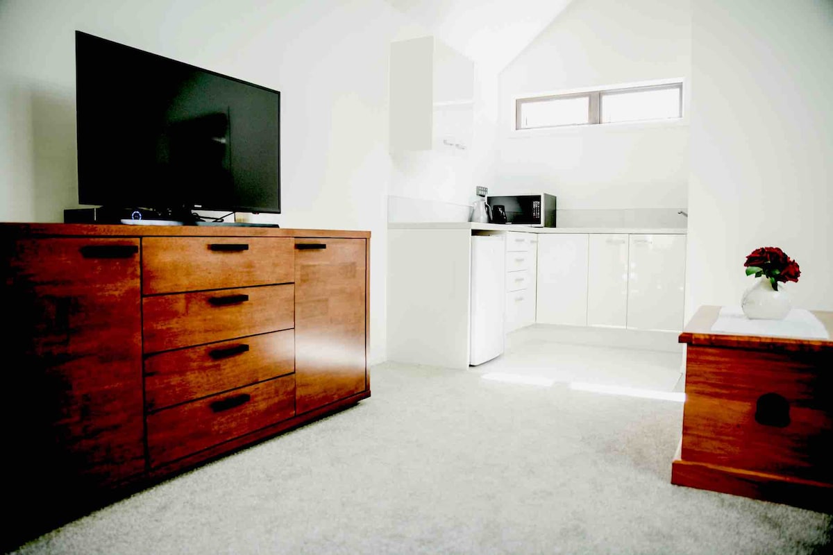 Centrally located, with elevated views. Your space is completely detached, with full privacy, carpark, lockbox entry. Making for the perfect spot for an intimate boutique feel get away. Tastefully designed modern lockwood/rustic chic complemented with rich textures in mind. Coffee & tea selection is provided within your room for your stay. Thoughtfully equipped appliances - kettle, toaster & microwave for your convenience. However no full kitchen cooking facilities.