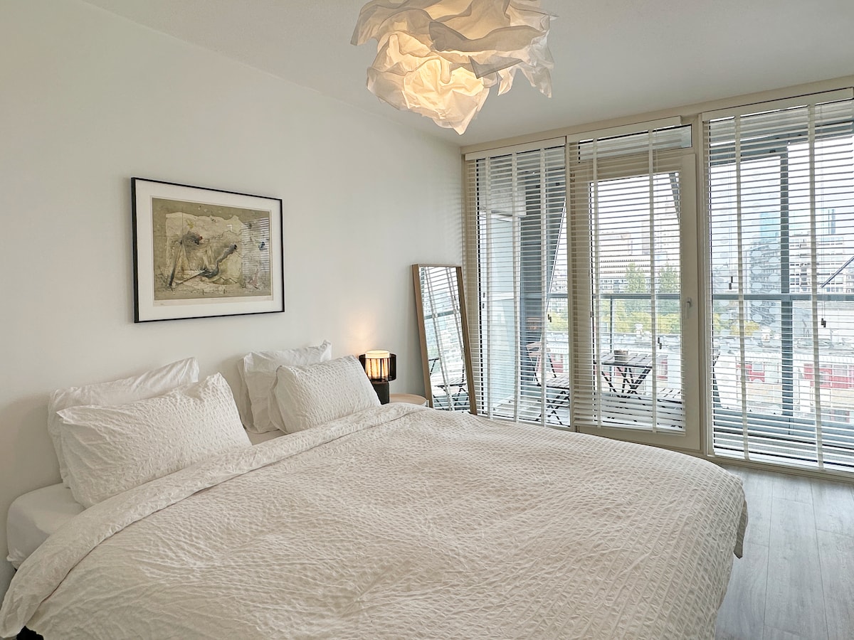 Modern industrial loft (68m²) with windows floor to ceiling on the 11th floor with stunning views - day and night - over Rotterdam harbor and city center. Supermarket, gym, sun terrace, and parking in the same building. Public transportation and water taxi/bus right across the street. The loft is located in the trendy & creative Lloydkwartier with several restaurants and iconic Euromast and park just a 5 min. stroll away. - Remote check-in - Sanitized before & after stays
