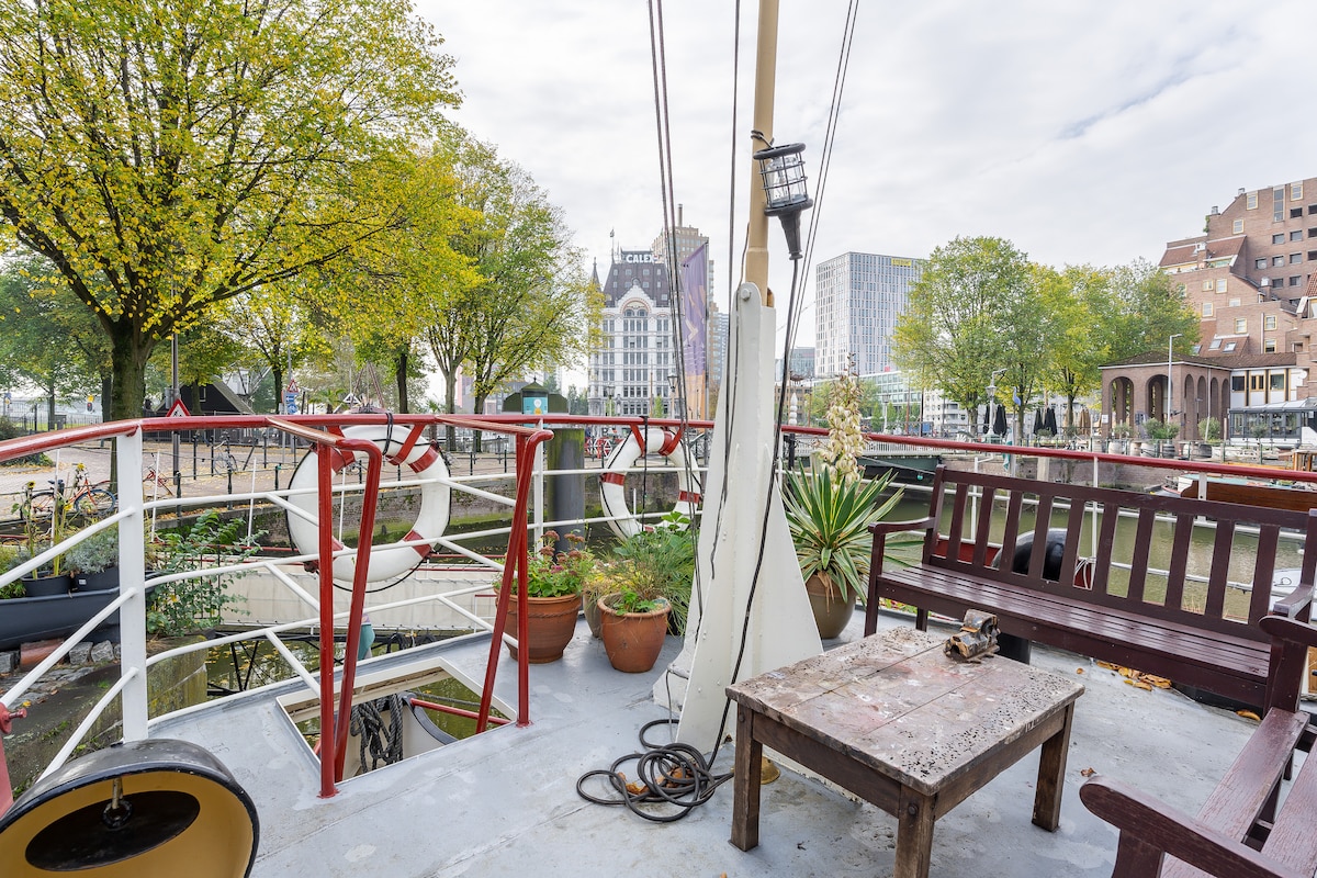 On this authentic boat you can live like a Rotterdammer, on a fantastic location right in the center of the city. The apartment on the Animathor has been completely renovated, but is still very much a boat. Your apartment is in the front of the ship. It has a private entrance, kitchen, a deck terrace and a fantastic view. The boat has three levels, there is a salon, a bedroom and bathroom below and a roof terrace on the top deck. You can reach the boat by an easy gangway.